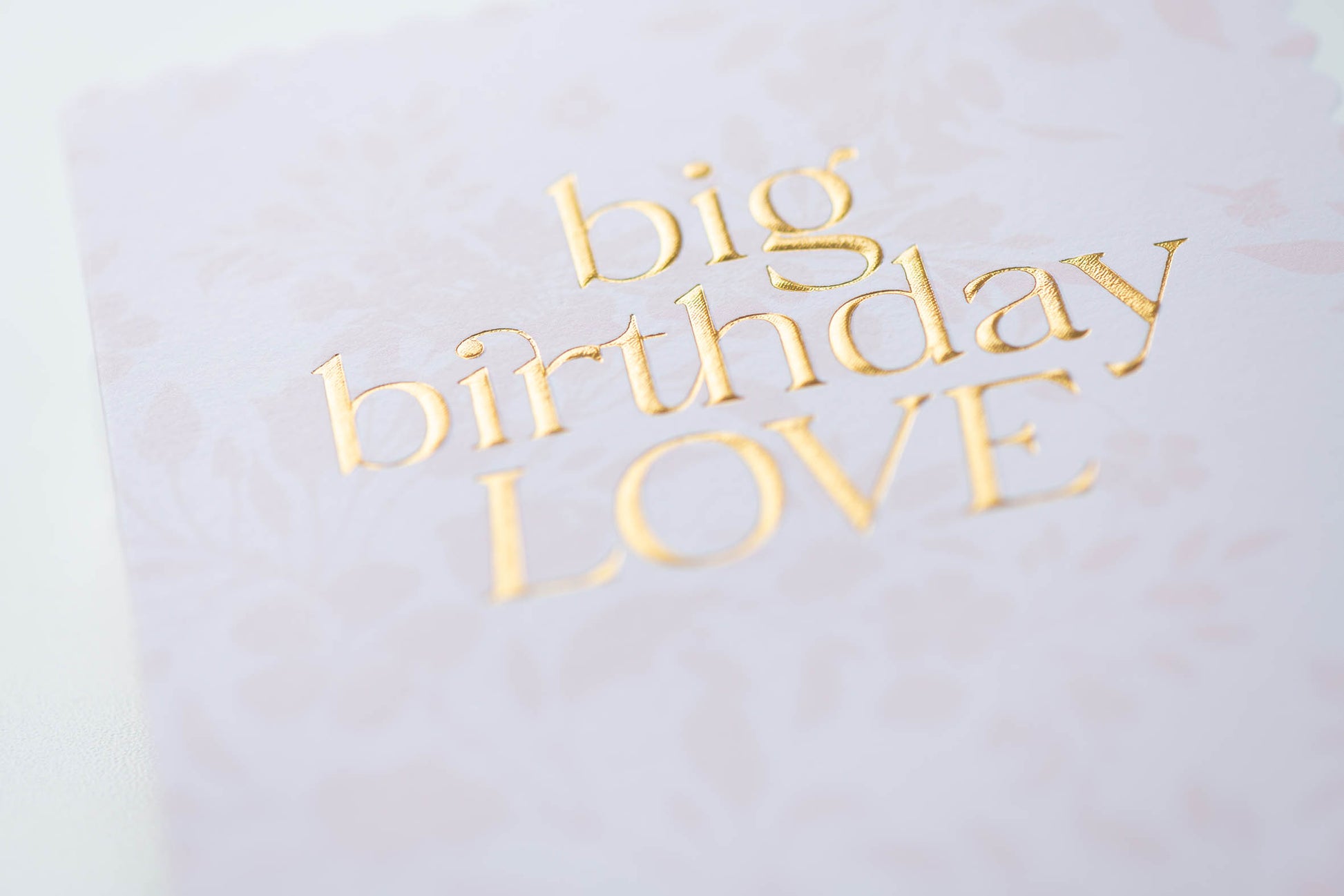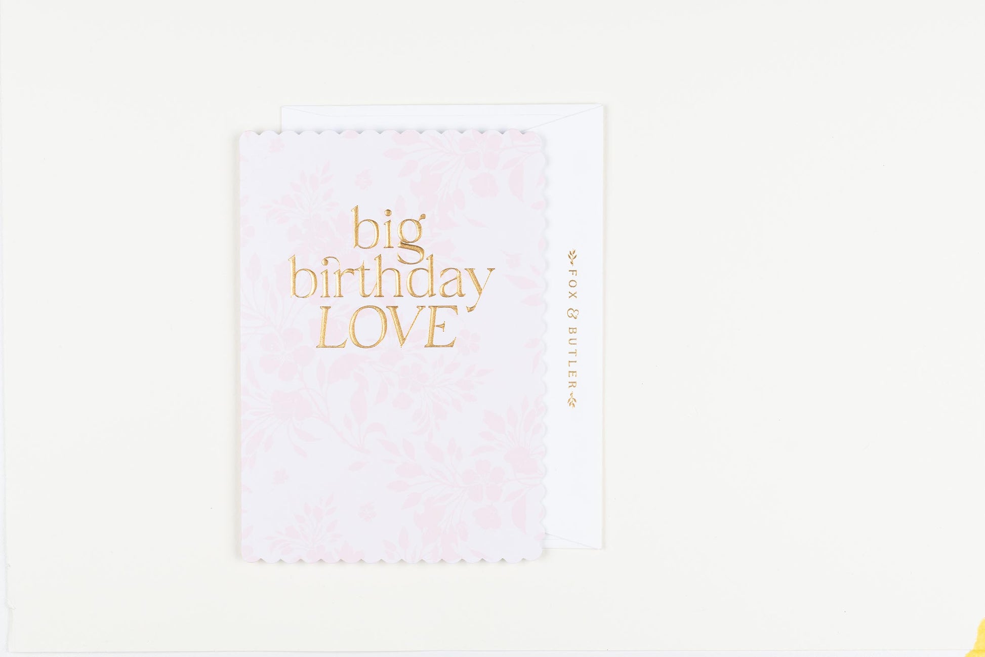 Our Big Birthday Love Card with soft pink floral features a scalloped edge & gold foil.