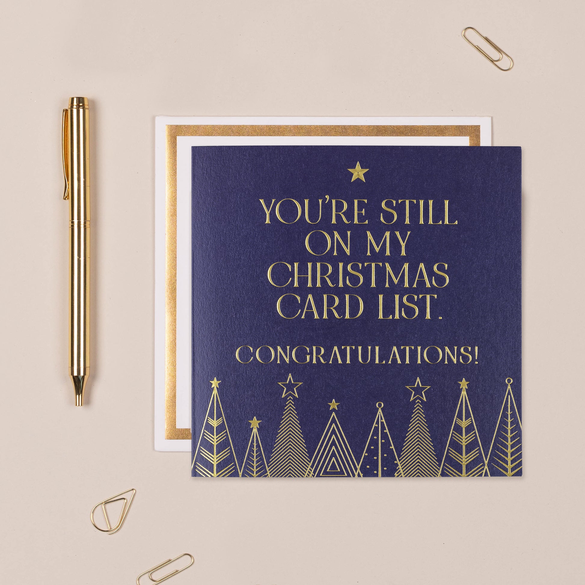 Our Christmas list card in midnight blue features contemporary gold foiled trees with embossed gold text & stars.
