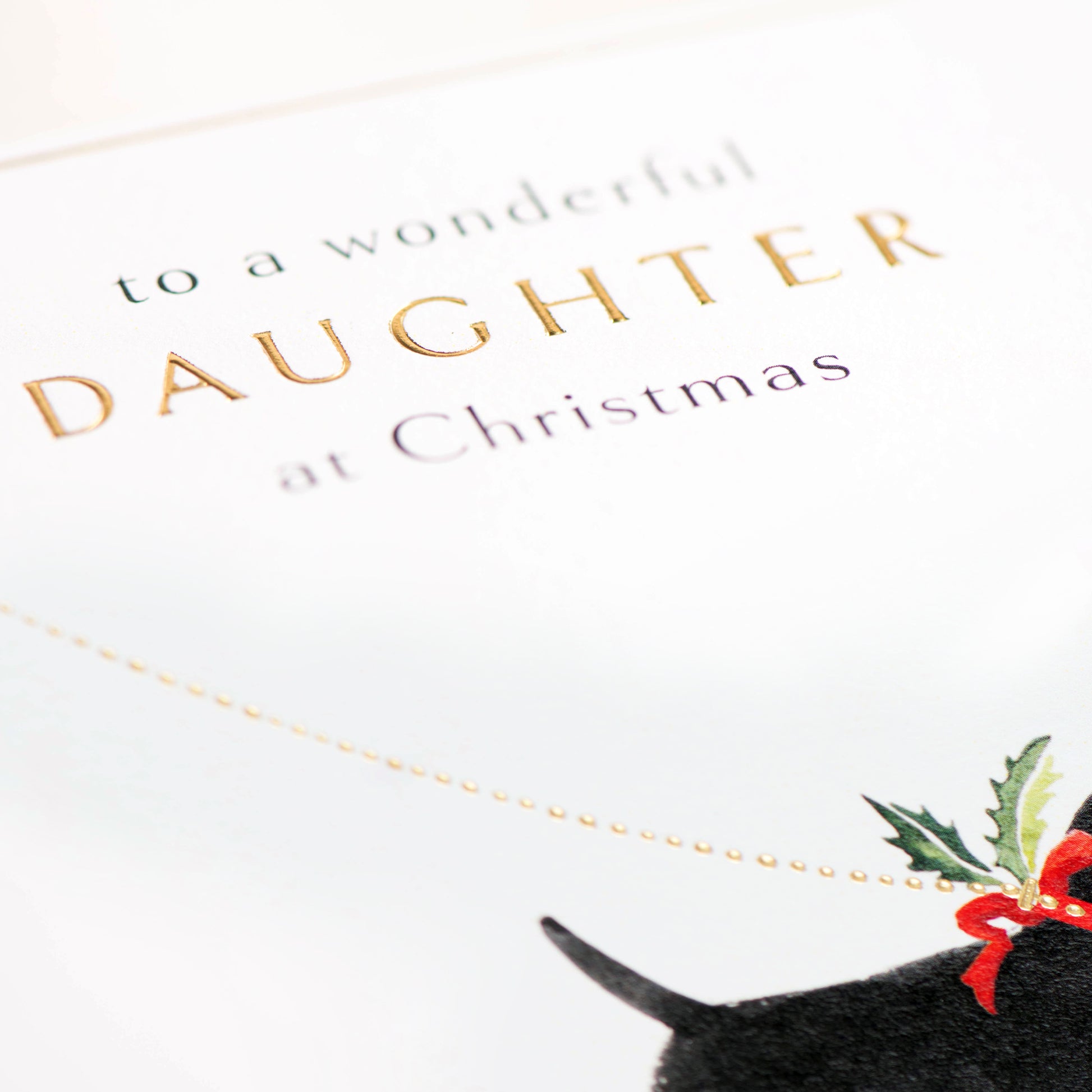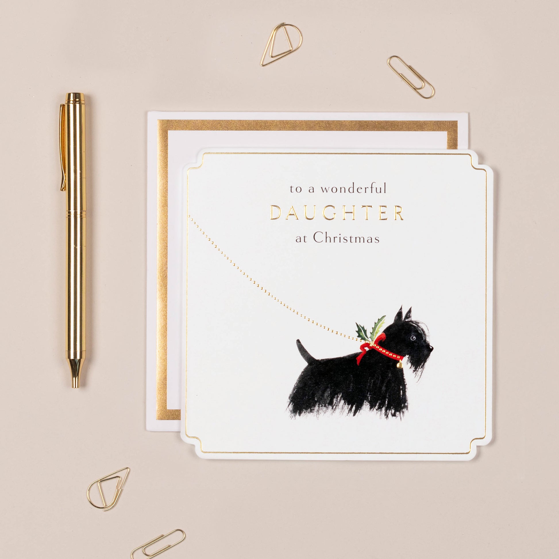 Our festive Daughter Scotty Dog Card in soft putty features intricate corners and an illustrated dog motif with delicate gold foil.